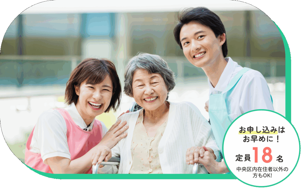 ご紹介先は、中央区内の介護事業所になります。まずは見学や相談からでも始められますので、関心のある方はどうぞお問い合わせください。